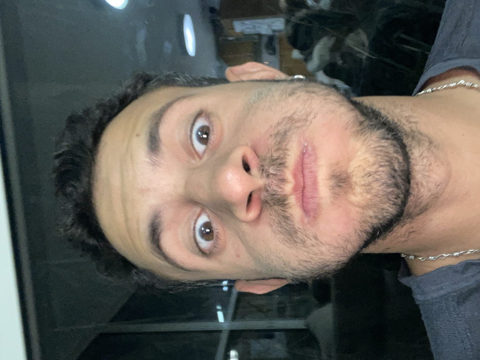 A male individual with dark, curly hair and a short beard occupies the central foreground, captured in a close-up, head-and-shoulders frame