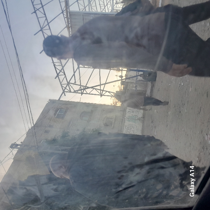 An outdoor scene with a building and metal structures. Three people are visible, one in the foreground appearing as a reflection. Graffiti is on the building's side. The sky is overcast, suggesting early morning or late afternoon. The scene appears to be taken through a window, with reflections and distortions present. The overall environment is urban or semi-industrial.