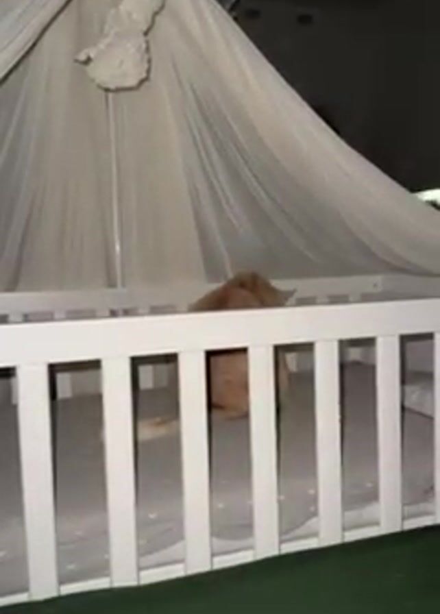 A wide shot shows a cat inside of a baby crib. The crib has a white wooden frame with a white, canopy-like structure. The mattress of the crib has a gray and white pattern. The room is dark, but there appears to be an indoor lawn visible at the bottom. Sounds of people talking can be heard.