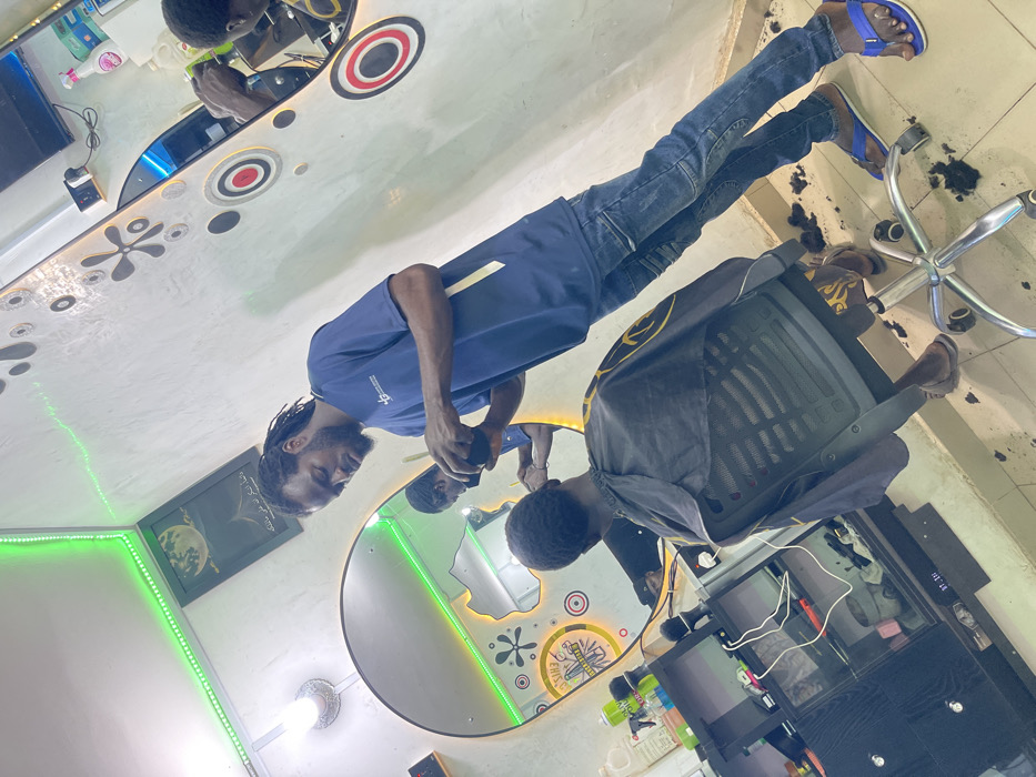 The image depicts an interior scene within a barbershop located in Unguwar Gabas, Nigeria