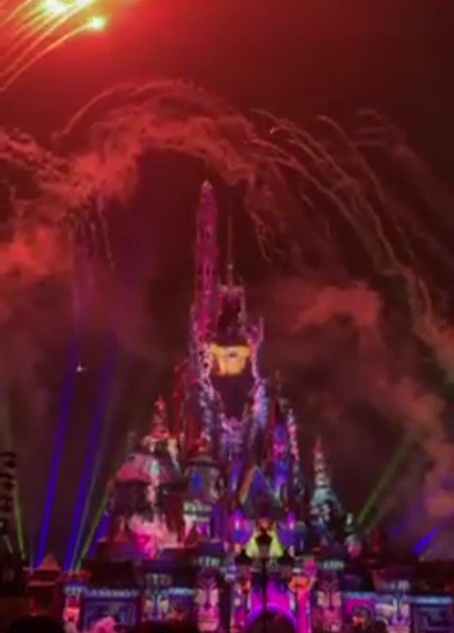 A nighttime scene features a Disney castle brightly illuminated with colorful lights
