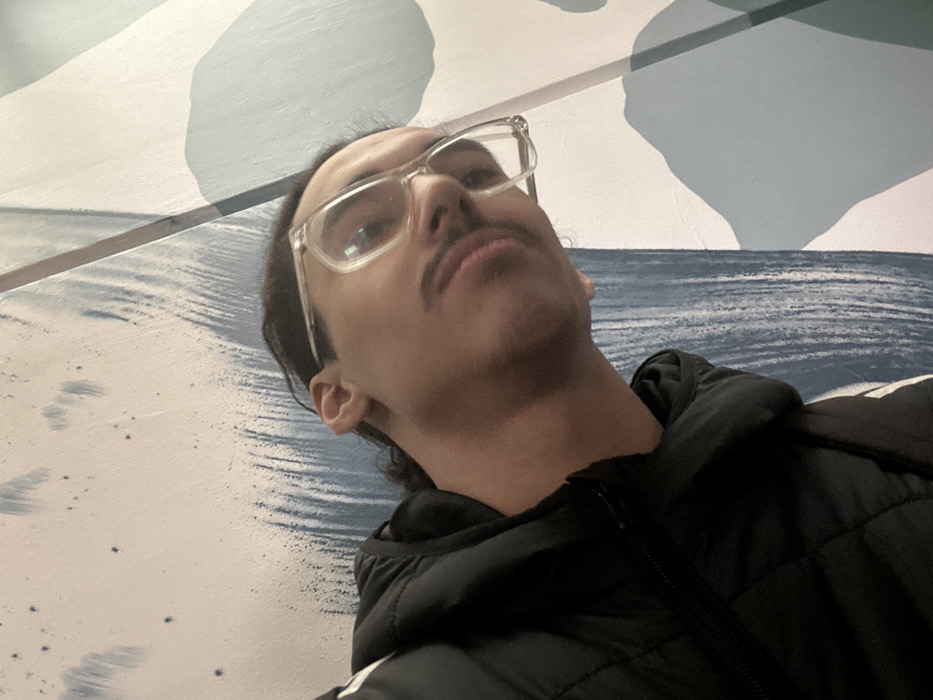 A male individual is depicted in a close-up, indoor portrait, positioned against a decorated wall in Strasbourg, France. The subject's head is tilted slightly upwards and to his left, with his gaze directed towards the viewer. He has dark hair, a prominent mustache, and a soul patch. He is wearing clear-framed eyeglasses, which display reflections of a light source. His attire consists of a dark, likely black, puffer jacket, with a faint white stripe visible on his upper left arm. The background wall features abstract artistry: the section immediately behind the subject displays dense, vertical blue brushstrokes against a lighter blue, while the adjacent section to the right shows lighter blue, organic, cloud-like shapes on a white surface, separated by a vertical seam. The lighting is even, suggesting an artificial light source.