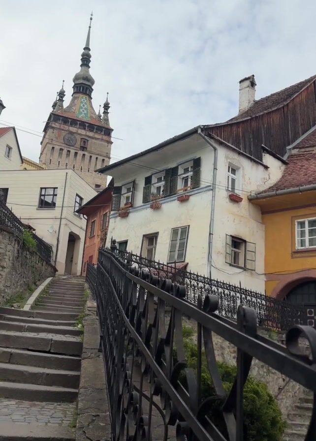 stone staircase leading up a hill in a European city. The staircase is flanked by a black wrought-iron railing on one side and stone walls on the other. On either side of the staircase are old buildings with colorful facades and tiled roofs. In the background, a tall clock tower with a green and brown tiled roof rises above the buildings. The sky is cloudy. A few people can be seen walking up the stairs. The camera is positioned at the bottom of the staircase, looking up.