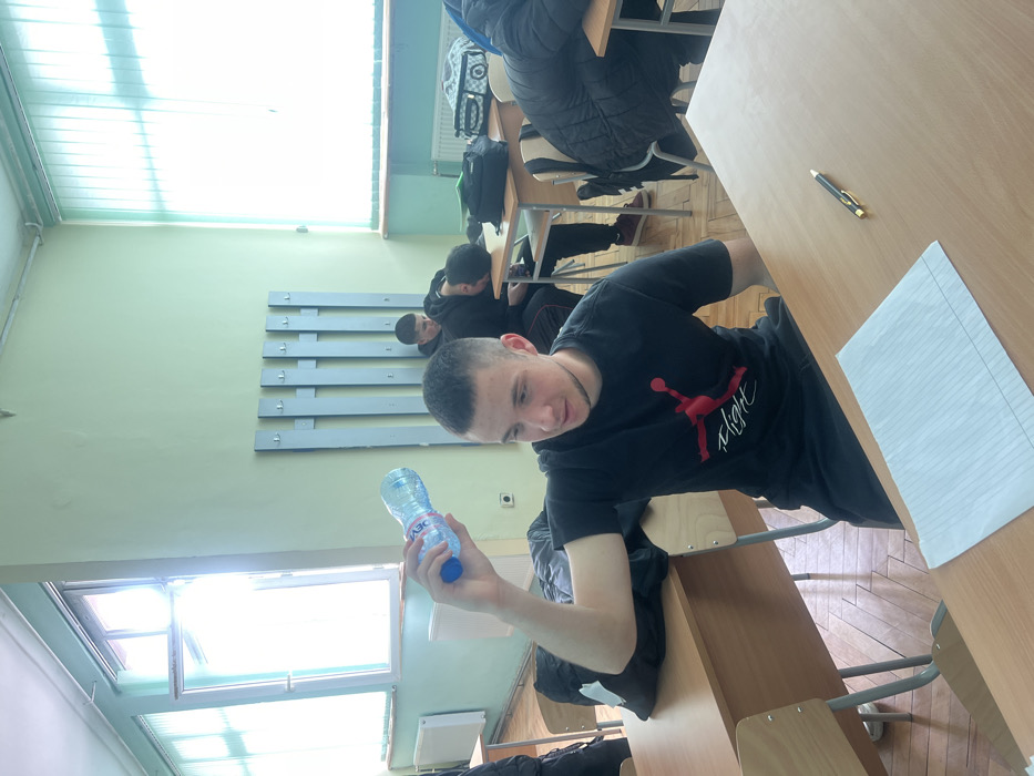 The image depicts an interior scene identified as a classroom in Kardzhali, Bulgaria. The room features light green walls, a wooden parquet floor, and multiple windows equipped with light-colored blinds. A series of vertical, light-colored wooden slats, consistent with a coat rack, is affixed to the back wall. In the foreground, a young male is seated at a light-toned wooden desk. He has short, dark hair and wears a black t-shirt featuring a white 'Jumpman' logo and 'Flight' text. His right arm is elevated, holding a partially full transparent plastic water bottle with a blue cap, displaying the 'DEVA' brand. His head is turned slightly to his right, with his gaze directed off-frame to the viewer's left. On the desk directly in front of him, a sheet of lined paper and a black and gold ballpoint pen are present. A dark garment is draped over the back of his chair. In the mid-ground, to the right of the primary subject, another young male is observed seated at an identical desk, with his head lowered onto the surface, appearing to be resting. A black backpack is positioned on his desk. A third young male is partially visible, seated at a desk further to the left. Radiators are installed beneath the windows along the wall.