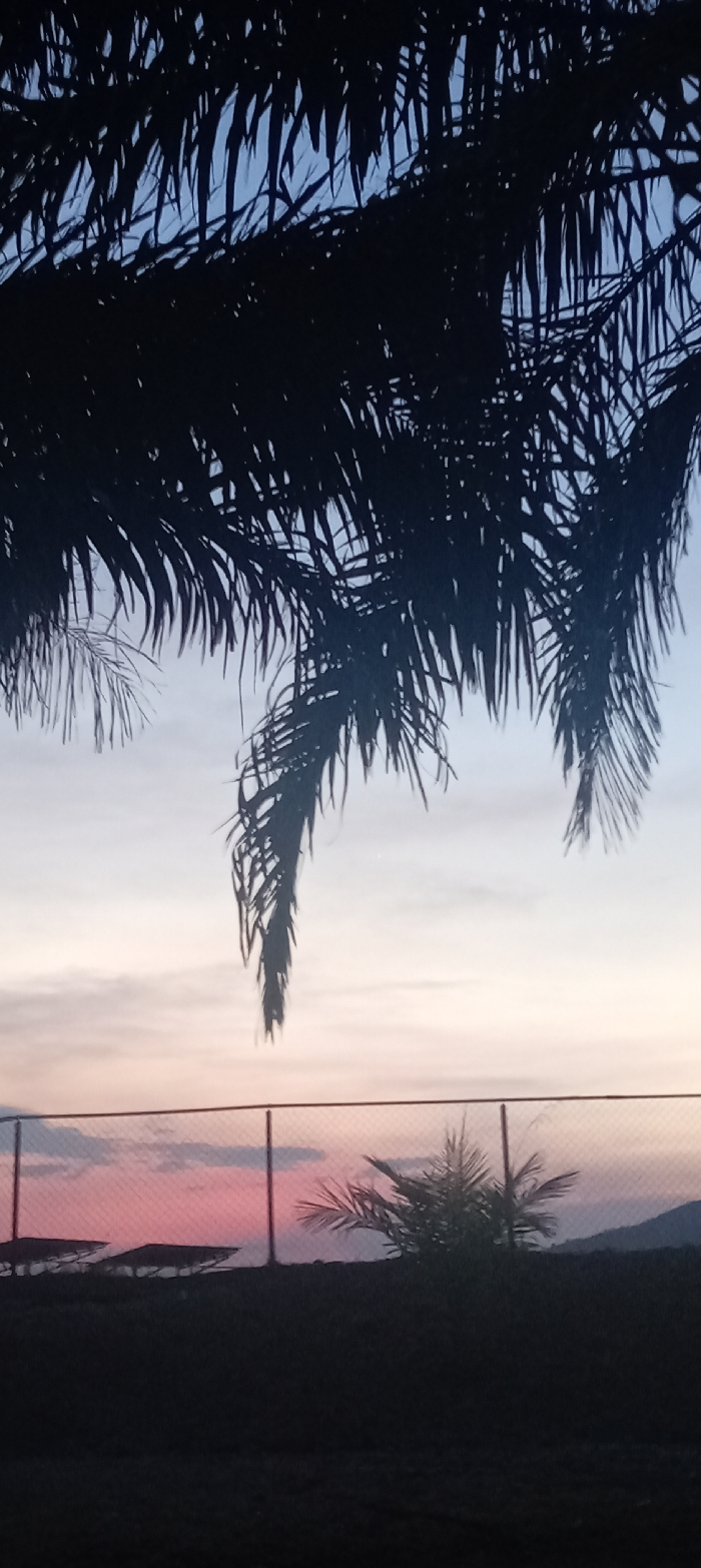 The image depicts an outdoor scene at twilight, likely sunrise or sunset, in Vallecito, Venezuela. The upper portion of the frame is dominated by the dark silhouettes of numerous palm tree fronds, obscuring approximately two-thirds of the sky. The sky transitions in color from light blue at the top to a gradient of pale pink and orange near the horizon, with subtle cloud formations visible. A horizontal chain-link fence, supported by several vertical posts, extends across the mid-ground. Below the fence, the foreground consists of a dark, undefined ground surface, from which the silhouette of a smaller palm plant emerges towards the right. In the distant background, low-lying hills or mountains are visible in silhouette against the colored horizon. No individuals, animals, specific actions, or interactions are present within the frame.
