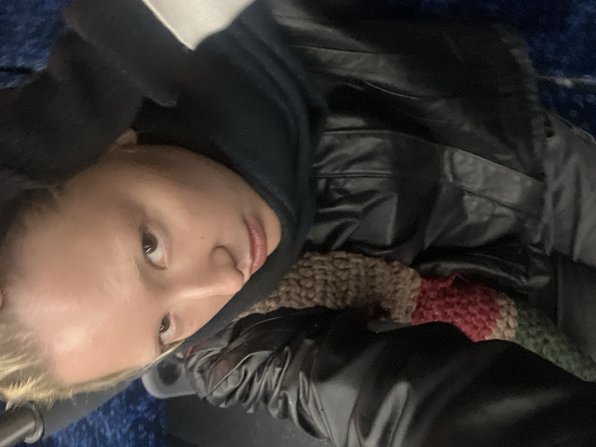 A high-angle, close-up self-portrait depicts a light-skinned individual, appearing female, with light-colored hair visible above the forehead. The individual has brown eyes and a neutral expression, looking directly at the camera. The subject is wearing a black, glossy jacket, possibly synthetic leather, over a dark-colored hooded garment that covers parts of the neck and chin. A multi-colored, knitted item, displaying distinct segments of brown, red, and green yarn, is visible on the chest, beneath the hooded garment. A black glove covers the individual's right hand, which is positioned near the head. The background is blurred, showing dark blue, textured fabric, consistent with upholstery found in a vehicle's interior. No external landmarks are discernible. The scene is located inside a public transport vehicle in the city of Tel-Aviv, Israel.
