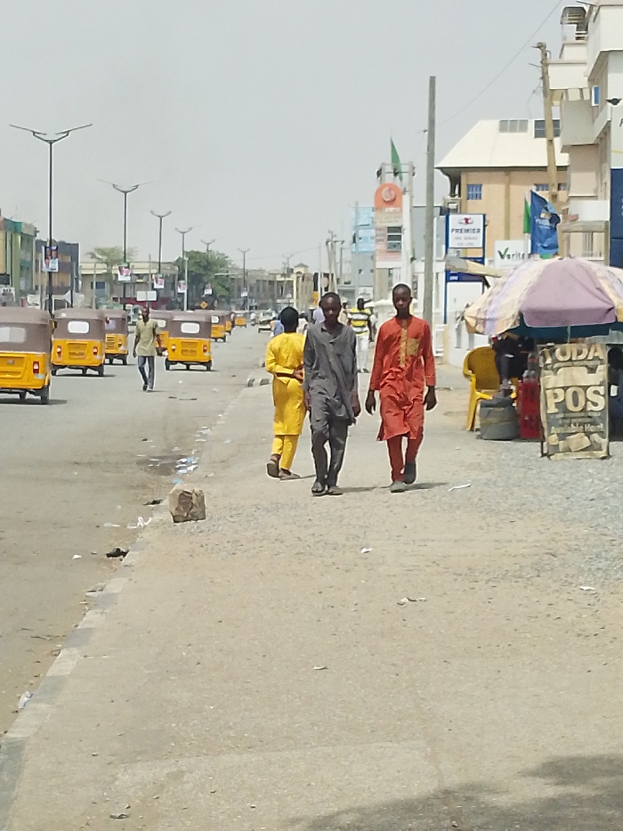The scene depicts a street in Babban Giji, Nigeria, under a bright, hazy sky