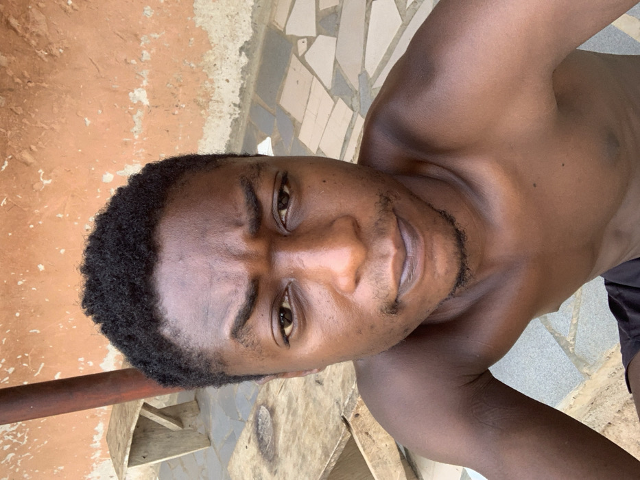 A tanned man gazes directly at the camera. He has short, dark hair, dark eyes, and a neatly trimmed beard. His bare shoulders and chest are visible, hinting at a sleeveless or shirtless state. The background features a mix of textures: a weathered wall, tiled flooring, and what appears to be a wooden structure. The angle is slightly tilted, adding a dynamic feel to the shot.