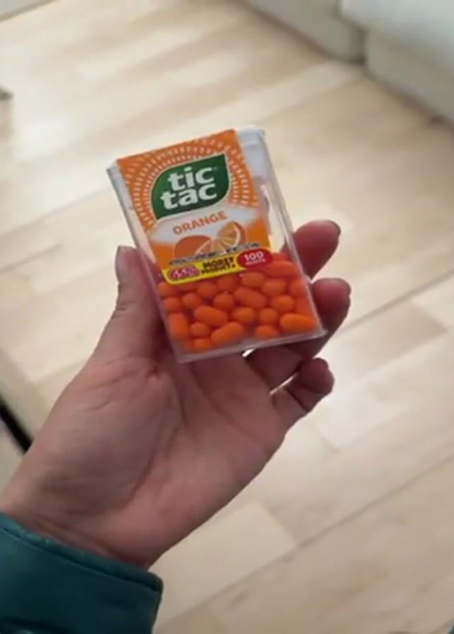 A person's hand is holding a clear plastic box of orange-flavored Tic Tacs. The box is labeled with "Tic Tac" in green, and "Orange" in orange. The hand shakes the box of Tic Tacs, making a rattling sound. The background includes a light-colored wooden floor and a cream-colored sofa.