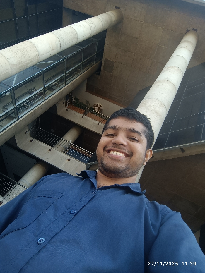 A man smiles in a selfie, wearing a blue button-down shirt. The photo is taken from a low angle, looking up at him. Behind the man is modern architecture with tall concrete columns and glass windows. Several levels of walkways and balconies are visible. The image is date-stamped "27/11/2025 11:39". The overall composition suggests the man is standing inside a large, contemporary building or complex.