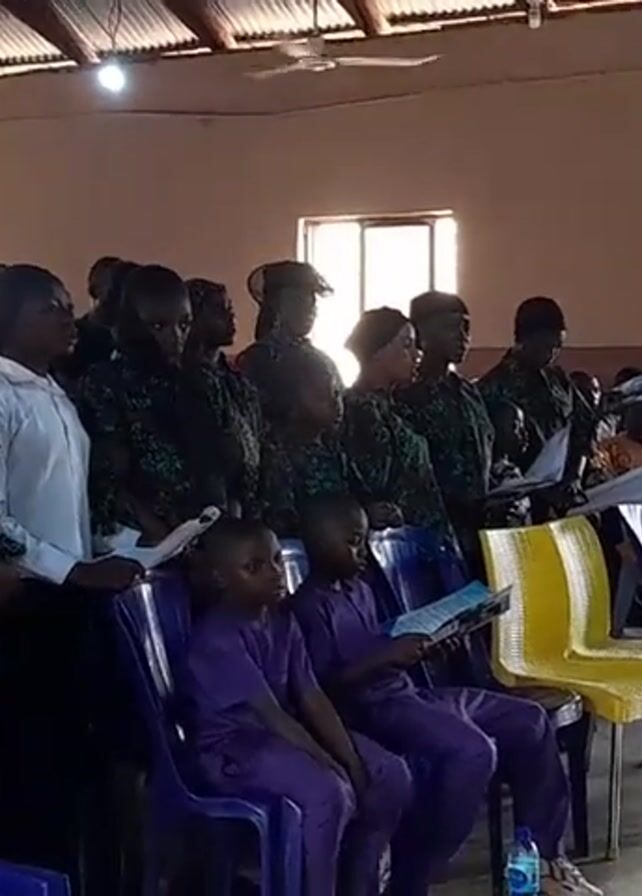 A choir comprised of adults and children is performing in a room that appears to be a church or hall. The singers are holding songbooks or sheets of music. The adults are dressed in a variety of outfits, including camouflage patterns, white shirts, and patterned dresses. Several children are seated in the front row, wearing purple outfits. The room has a corrugated metal roof and is lit by fluorescent lights and natural light from windows. There are chairs set up for the audience, and a music stand is visible. Some of the adults are singing, while others are standing and observing.