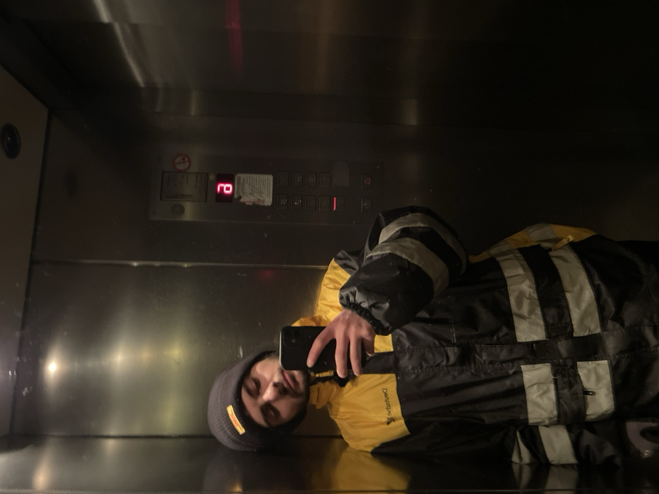 A person lies in an elevator, taking a selfie. The individual wears a black beanie with a yellow logo, a black and yellow jacket with reflective stripes, and holds a smartphone. The elevator's floor is reflective. The elevator's control panel indicates the 8th floor with a red display.