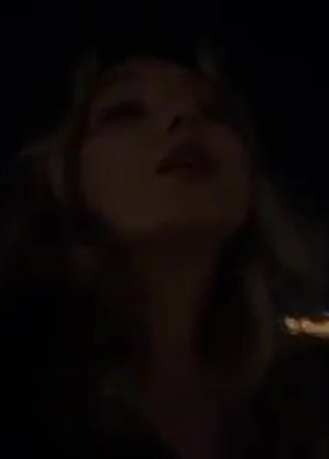A young woman is recording a selfie video at night. The background shows a body of water with illuminated buildings and lights reflecting on the water. The woman is wearing a dark jacket and has blonde hair. She is looking at the camera and speaking. She eventually smiles slightly. The scene appears to be outdoors at night.