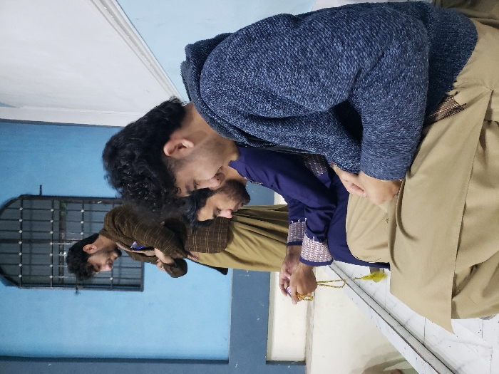 Three men are in a room with light blue walls and white ceiling. The man closest to the viewer wears a blue hoodie, and khaki pants. Another man is kneeling in a navy blue top. The third man wears a brown jacket and is standing near a window with bars. The scene is intimate. The men appear to be praying or observing a religious practice.