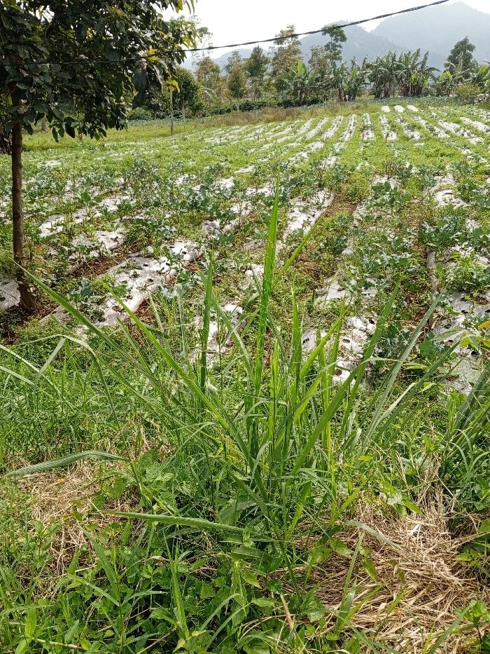 A field of crops stretches towards distant hills. Rows of plants are visible under white plastic sheeting. In the foreground, a patch of tall green grass is surrounded by shorter grass and dried leaves. A thin tree stands to the left, and taller trees and banana plants dot the horizon.