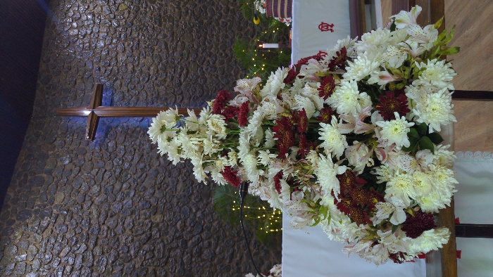 A vibrant floral arrangement, dominated by white daisies and wine-colored blooms, sits atop a white altar cloth. A wooden cross is affixed to a textured, dark stone wall. Soft, ambient lighting adds depth to the wall and highlights the cross. In the background, a candle flickers amidst greenery, possibly a Christmas tree.