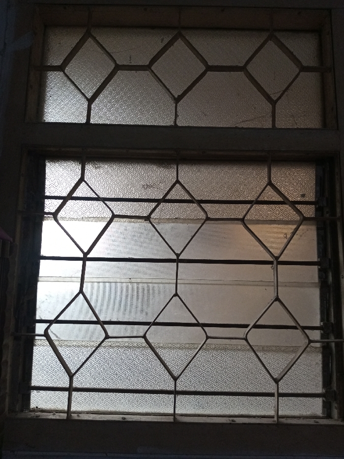 A close-up captures a window with a detailed, decorative metal frame. The frame features diamond and triangle shapes. The glass itself is textured, creating a slightly distorted view outside. The window is framed by a weathered, likely wooden structure, adding a vintage aesthetic. The overall lighting is subdued, resulting in a soft contrast and a sense of age.