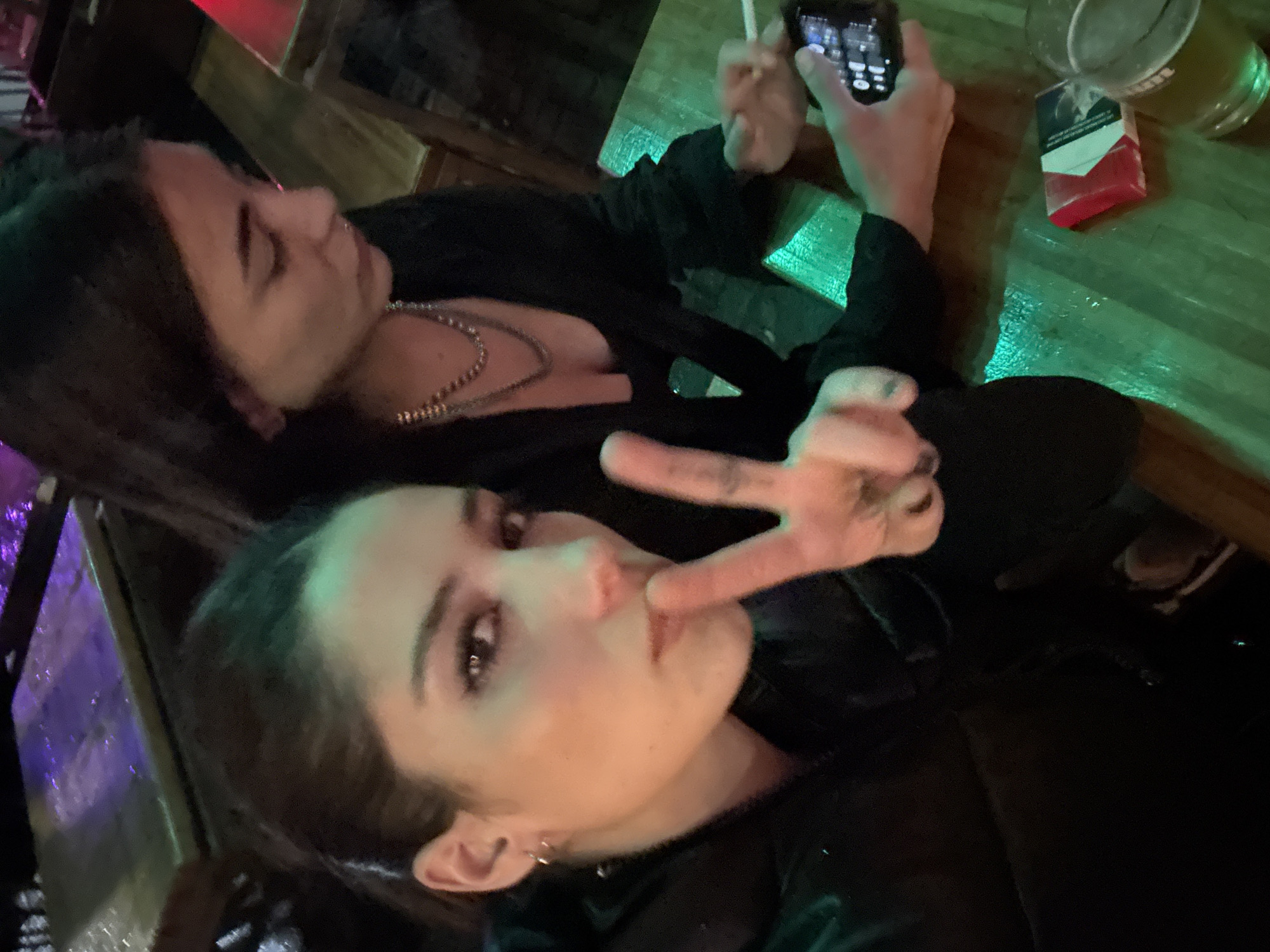 This image depicts an indoor scene within a dimly lit bar or pub environment. Two young adult females are seated at a wooden table. The female in the foreground, positioned to the left, has dark hair pulled back and wears dark clothing. Her face is directed towards the camera, maintaining eye contact. Her right hand is raised, with the index and middle fingers forming a "V" sign, and the index finger touches her lips. She has small hoop earrings. The second female, seated behind and to the right, also has dark hair and wears dark clothing, including layered necklaces. Her gaze is directed downwards and to the right, away from the camera. Her right hand holds a lit cigarette, and her left hand holds a black smartphone. On the wooden table in the foreground, a clear glass filled with an amber liquid, likely beer, topped with foam, is visible. Adjacent to it is a red and white cigarette pack, identifiable as Marlboro. The environment is characterized by low light, with a prominent green hue illuminating the table surface and a softer purple/red light in the background. The precise location within the city of Buenos Aires, Argentina, cannot be determined from the visual information provided in the image.