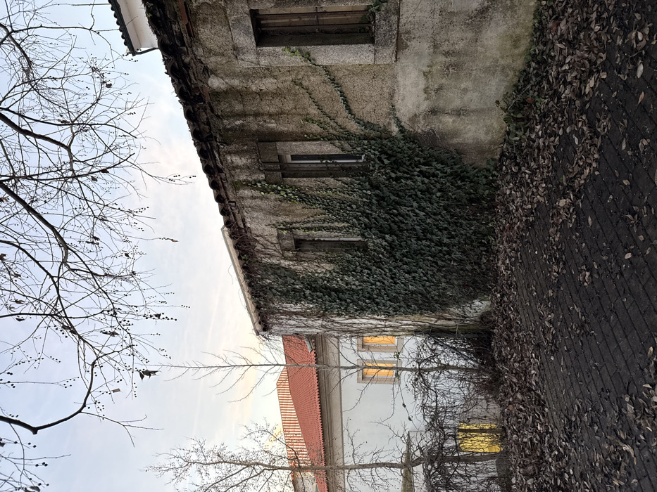 A low-angle shot shows a corner building covered with ivy on the right. The building has three visible windows. A brick pathway covered in fallen leaves is adjacent to the building. Bare tree branches are visible on the left. In the background, a second building with orange-lit windows is seen, partly obscured by the tree branches. The sky is a pale, even color.