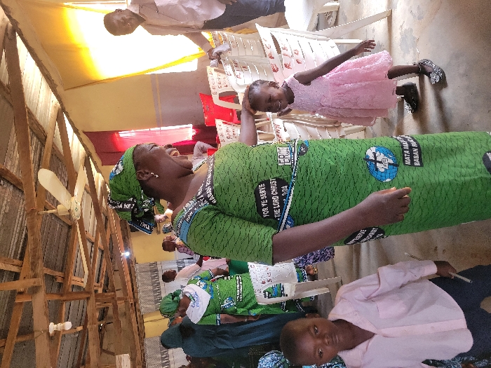This image captures an indoor gathering in Kwamba, Nigeria, depicting approximately fifteen individuals within a simple, functional structure. The ceiling features exposed wooden beams supporting corrugated metal sheeting, with a white ceiling fan centrally mounted. Walls are painted in light hues, including yellow and grey sections, and draped with red and yellow fabrics in the background. The floor is an unpolished concrete surface. In the foreground, a Black adult female in a vibrant green Ankara-style dress with a matching headwrap is prominent. Her dress is adorned with text, including "FOR YE SERVE THE LORD CHRIST 1:24," and a circular logo featuring a globe and cross with additional text "MATA MAI BABAN RUGA." She is observed with her mouth open in a wide smile or laugh, looking towards her right (viewer's left). Her right hand rests gently on the head of a Black female child, approximately 3-5 years old, standing to her right. This child wears a light pink sleeveless dress and dark shoes with glitter accents, smiling broadly and looking towards the camera. To the left of the adult female, a Black male child, approximately 5-8 years old, stands looking directly at the camera with a neutral expression, holding a thin dark object in his right hand. He is dressed in a light pink collared shirt and dark trousers. In the mid-ground and background, other attendees, primarily women in similar green patterned dresses and headwraps, are visible. An adult Black male in a light-colored collared shirt and dark trousers stands near white plastic chairs in the background on the right, smiling and looking towards his right. Numerous white plastic chairs, some bearing written labels, and a few red plastic chairs are arranged throughout the space. The overall atmosphere appears communal and relaxed.