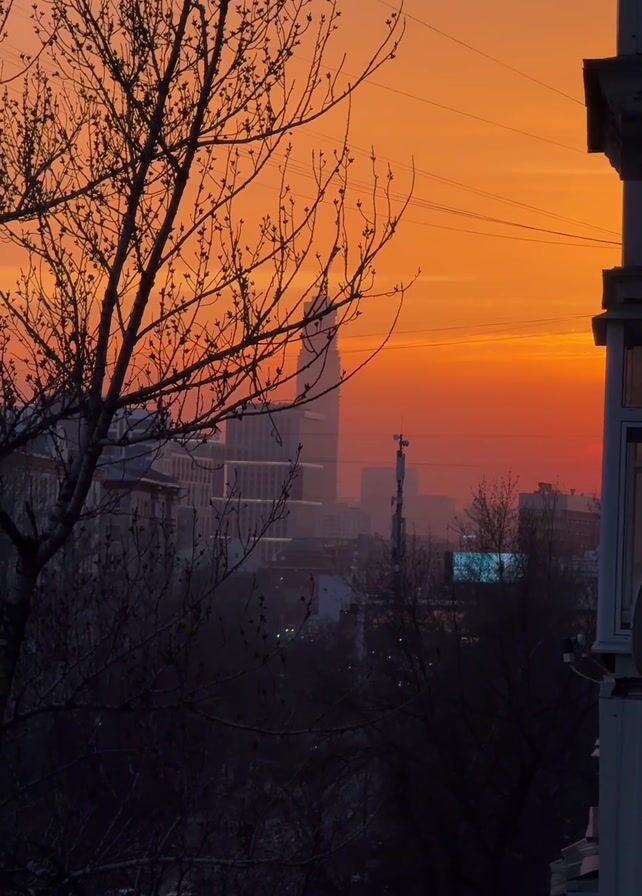 city skyline at dusk or dawn, with a fiery orange sky. Silhouetted buildings and a bare tree branch dominate the view. Power lines stretch across the sky. There are other buildings, trees and a glimpse of a blue illuminated sign in the mid-ground. The view is framed by a building on the right.