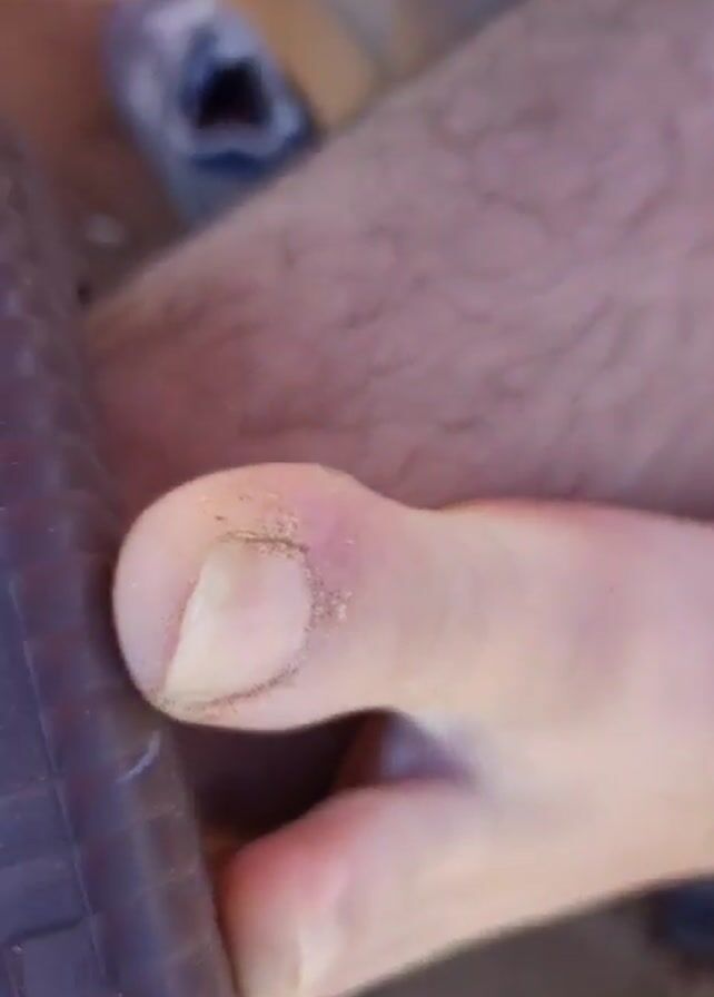 A man is sitting outdoors, possibly at a beachside cafe or restaurant. The video begins with a close-up of his toe covered in sand. The camera then pans up to show the man sitting in a light blue t-shirt and dark shorts, and holding a blue object, possibly a phone. He appears tired or pensive as he rests his hand on his forehead. The background shows a beach with water and a clear blue sky.