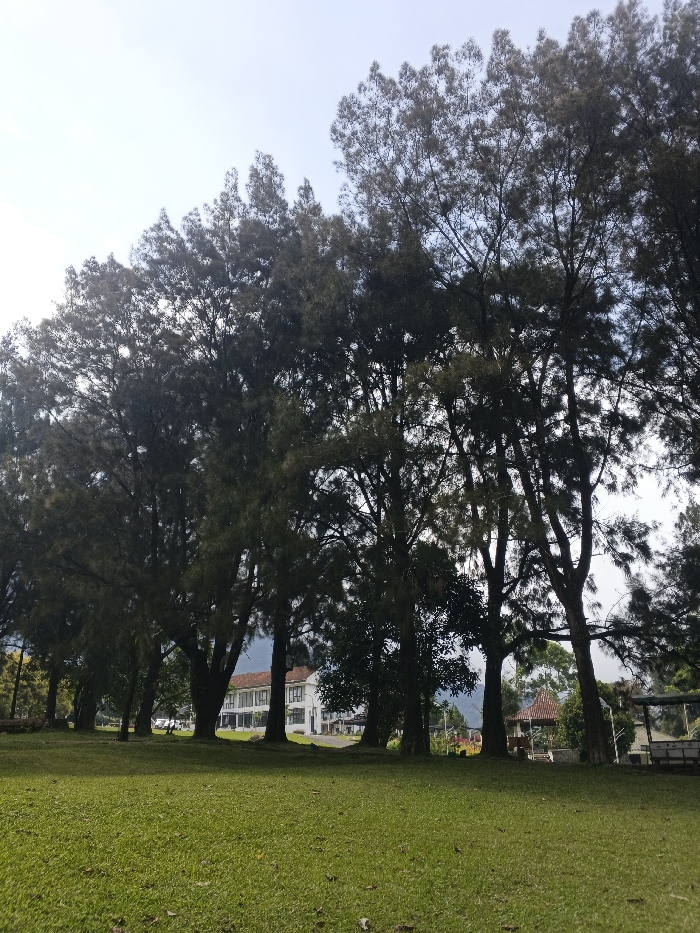 The image depicts a daytime outdoor scene at what appears to be the Goldridge Hotel in Kwekwe, Zimbabwe. The foreground features a neatly manicured, vibrant green lawn under diffuse lighting. A line of tall, coniferous-like trees with dark green foliage dominates the mid-ground, extending across the frame and partially obscuring the background. Through and behind the trees, a white two-story building with a prominent reddish-brown tiled roof is visible, identified as the Goldridge Hotel. To the right of this main building, a smaller structure with a reddish, multi-faceted roof, possibly a gazebo or pavilion, is partially visible. Further to the right, another covered outdoor seating area or shelter is present. Distant mountains or hills are faintly discernible on the horizon behind the structures. The sky overhead is bright and clear with some atmospheric haze. No individuals are visible, and no discernible actions or interactions are taking place.