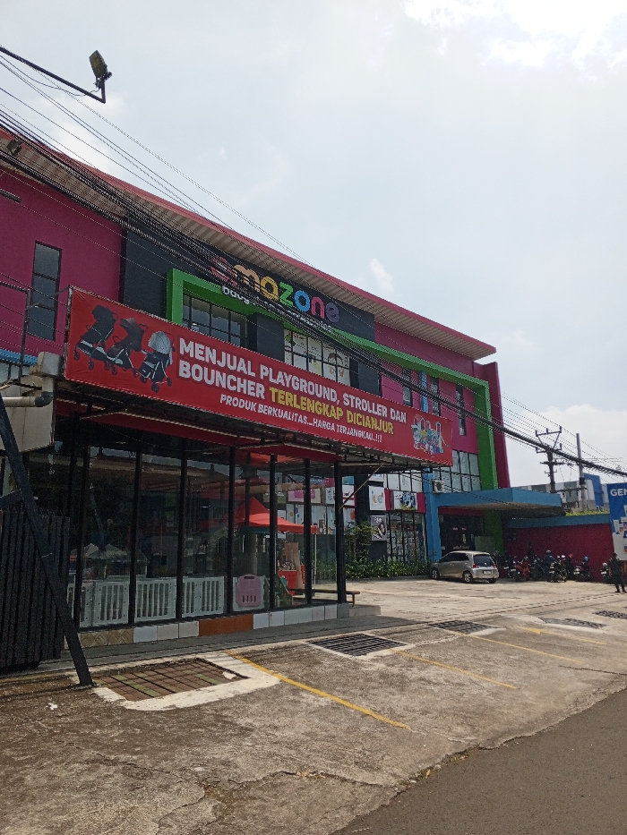 This image depicts a multi-story commercial building under a mostly clear sky, with the sun casting bright light. The building's upper facade is bright pink, with a green section below, and a blue section at the lower level around a covered entranceway. Prominently displayed horizontally across the front of the building is a large red banner. The banner features images of baby strollers and text in Indonesian: "MENJUAL PLAYGROUND, STROLLER DAN BOUNCER TERLENGKAP DICIANJUR PRODUK BERKUALITAS...HARGA TERJANGKAU!!!" (Translating to: "SELLING THE MOST COMPLETE PLAYGROUND, STROLLER AND BOUNCER IN CIANJUR QUALITY PRODUCTS... AFFORDABLE PRICES!!!"). This explicitly places the location in Cianjur, Indonesia. Above the banner, the building displays signage that reads "mazone" with "DOVS" below it, rendered in multi-colored letters. The ground floor of the building features large glass windows, behind which white baby cribs or playpens, a red umbrella, and other child-related items are visible. In front of the building is a concrete parking lot marked with faded yellow lines for parking spaces. Two square metal grates are embedded in the pavement. One silver minivan, possibly a Toyota Kijang Innova, is parked in the lot to the right of the center. Further to the right, under a partial overhang, approximately ten motorcycles are parked in a cluster. A utility pole with multiple black electrical wires is visible on the far right, and another partial sign displaying "GEN" is discernible. One individual is partially visible standing near the parked motorcycles on the far right. Overhead, numerous black electrical wires traverse the scene, and a single street light is mounted on a pole above the building.