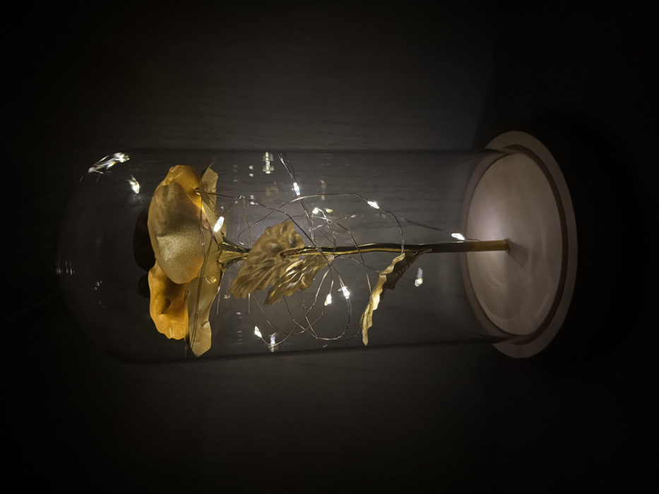 - "A gilded rose is encased in a glass dome and lit with fairy lights" by FM-c95o22, licensed under CC BY 4.0