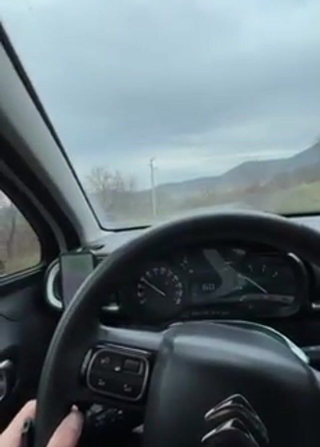 A video shows the view from inside a moving car, focusing on the driver's hands on the steering wheel and the dashboard