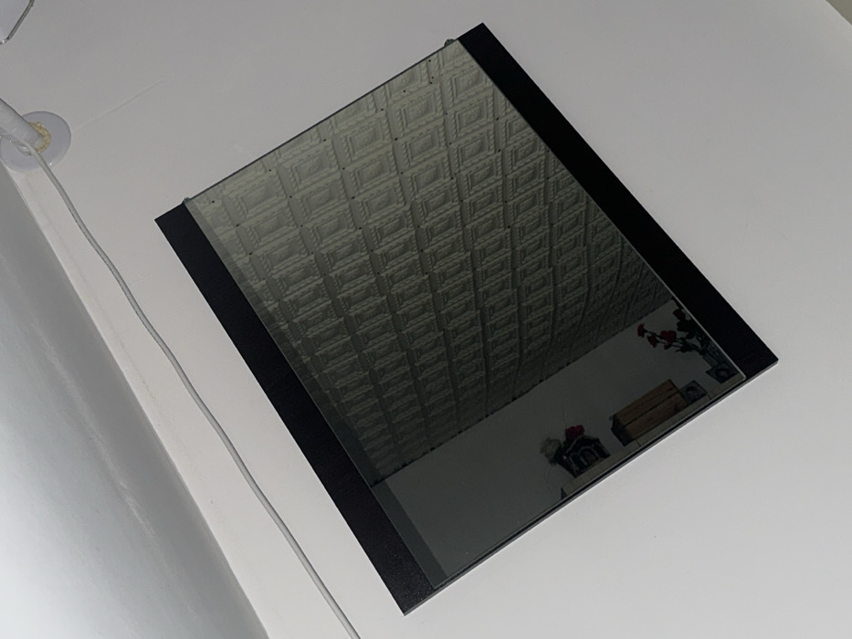 This image depicts an interior scene in Smyadovo, Bulgaria, captured from an elevated, downward-angled perspective. A rectangular mirror with a black frame is mounted diagonally on a plain white wall, occupying the central and lower portions of the frame. The mirror's reflective surface displays a textured wall with a repeating diamond pattern across most of its area. A partial reflection of another section of the room is visible in the lower left of the mirror, showing a segment of a white wall, a light-colored wooden cabinet, and a small cluster of red flowers in a dark vase. Above the mirror, the intersection of a white wall and a white ceiling is visible. A white electrical cable runs along this wall-ceiling junction, originating from the upper left and terminating at a white circular electrical fitting situated near the upper right corner of the overall image.