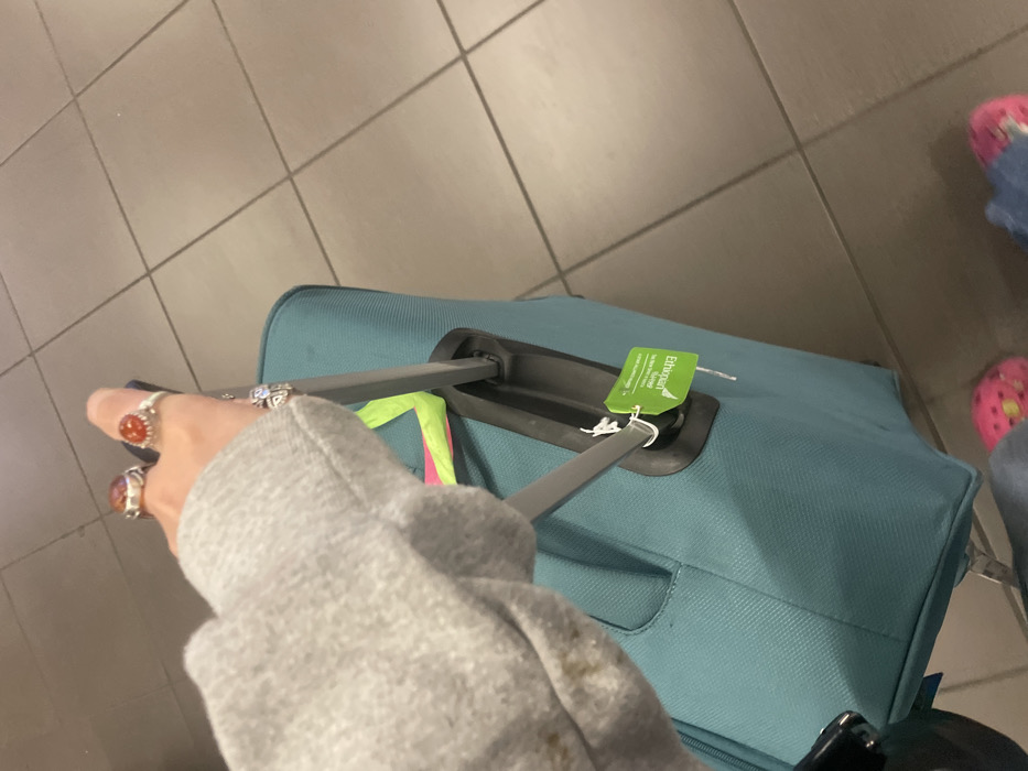 - "The image displays a downward view of an unidentified individual's right arm and hand, which is gripping the extended, grey two-pole handle of a teal-colored soft-sided rolling suitcase" by FM-AyUtz1, licensed under CC BY 4.0