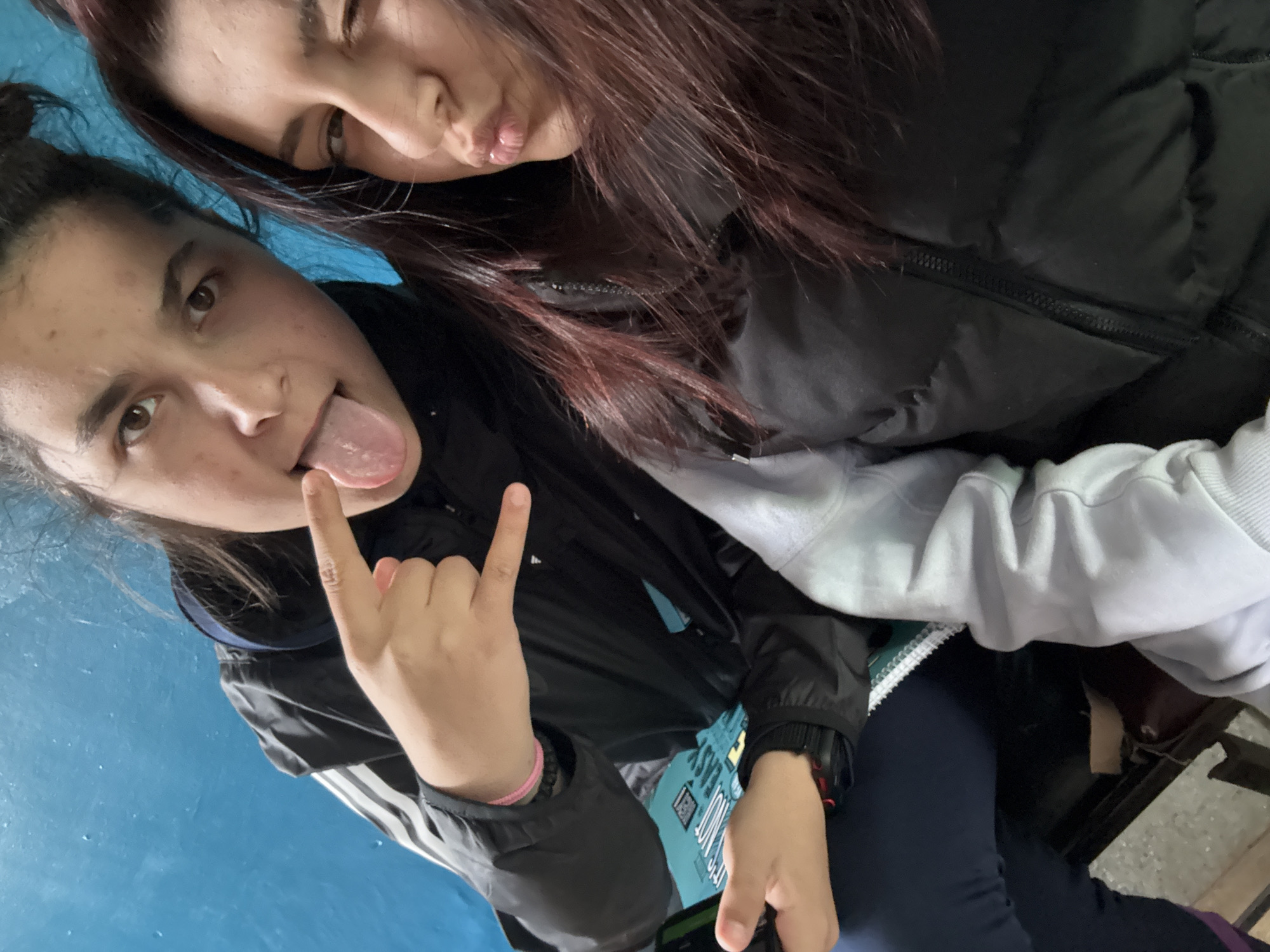Two young females are depicted in a close-up, chest-up shot against a textured light blue background, suggesting an indoor setting. The individual on the left, positioned slightly forward, has dark hair pulled back and brown eyes, looking directly at the camera while extending her tongue. Her right hand is raised, forming a "rock and roll" or "devil horns" gesture. She wears a black athletic jacket with white stripes on the sleeves, dark pants, a black digital watch with red accents on her left wrist, and a pink elastic band on her right wrist. A blue notebook with white pages, displaying partial text including "IT'S NOT EASY" and a QR code, is visible on her lap. The second individual, partially visible on the right side of the frame, has long reddish-brown hair, is winking with her visible left eye, and has pursed lips in a "kissing" expression. She wears a black puffer-style vest over a light-colored long-sleeved garment. Both subjects are directly engaging with the camera. The specific location within the city of Cherven Bryag, Bulgaria, cannot be identified from the visual content of this image.