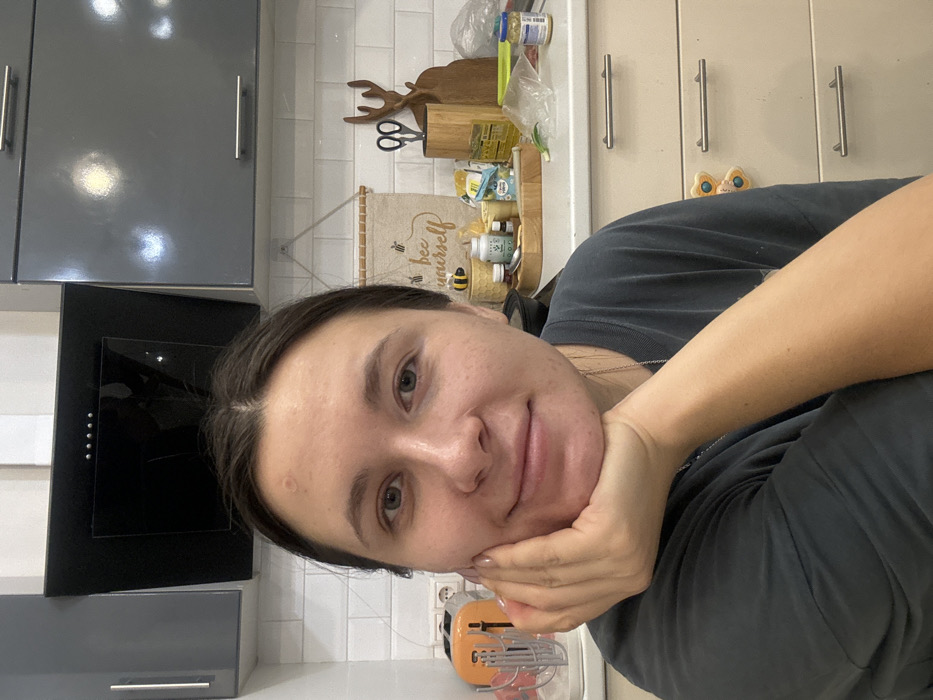 A young adult female, appearing to be in her mid-20s to early 30s with dark hair parted down the middle and a light complexion, is depicted from the chest up, gazing directly at the camera with a slight smile. Her left hand supports her chin, with her arm resting horizontally across her midsection. She is wearing a dark grey, short-sleeved t-shirt. A circular blemish or patch is visible on her forehead slightly above and between her eyebrows. The background reveals a residential kitchen environment, consistent with typical homes in Moscow, Russia, though no external identifying city features are visible. A black, slanted glass range hood is centrally positioned above a white subway tile backsplash. Flanking the hood are dark gray, glossy upper cabinets with silver bar handles. Below the backsplash is a light-colored countertop. On the countertop, from left to right, are: an orange toaster, a white dish rack with multiple compartments, and a white electrical outlet. Further right, a wooden knife block containing multiple knives and a pair of black-handled scissors is visible. Behind it is a decorative wooden cutout resembling deer antlers. A beige fabric wall hanging with a "bee yourself" motto and bee illustrations hangs on the backsplash. A wooden tray on the countertop holds various containers, including bottles, jars, and a small black bowl. A clear plastic bag containing green vegetable matter and a small jar with a yellow lid are also present on the countertop to the right. The lower section of light-colored kitchen cabinets with silver bar handles for drawers is visible at the bottom right.