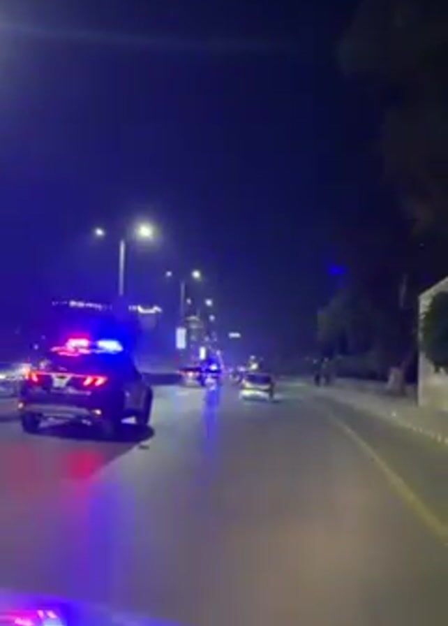 At night, a convoy of police cars with flashing red and blue lights drives down a well-lit street