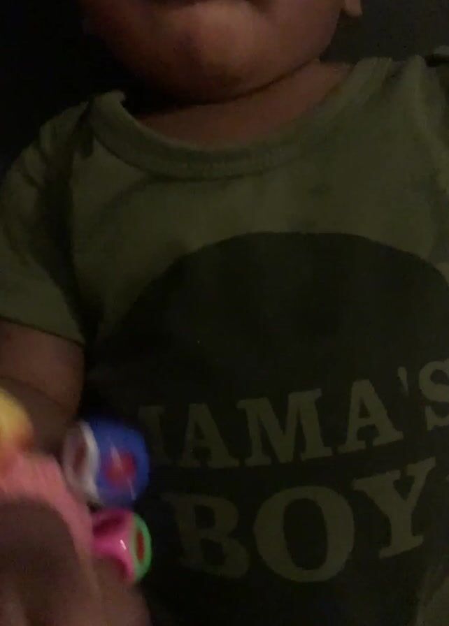A baby wearing a green onesie that says "Mama's Boy" is lying on a dark gray or black surface, looking directly at the camera. They have a toy rattle on their left wrist. The toy is pink and has colored cube-shaped sections. Loud music or audio is playing in the background. The baby appears to be calm.