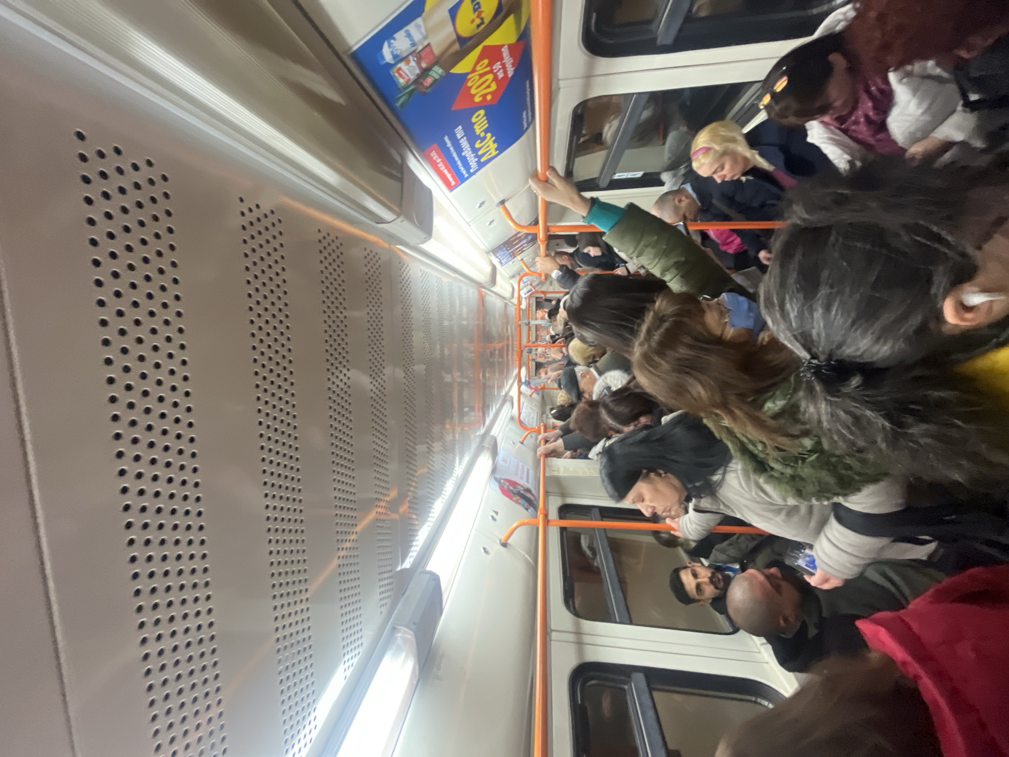 interior of a crowded subway car, likely in Sofia, Bulgaria