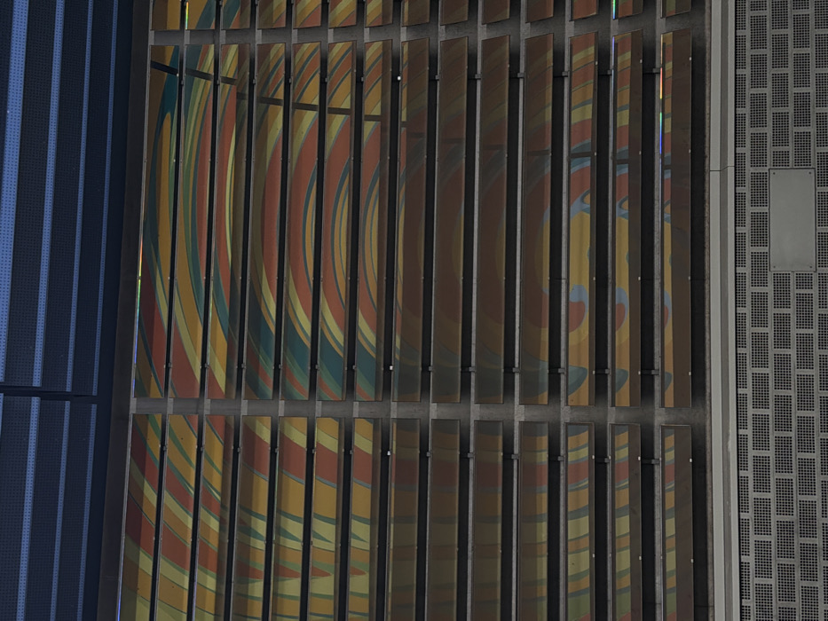 The image displays a section of the west facade of the Fürth Hauptbahnhof (main train station) in Fürth, Germany. The scene is dominated by a grid of dark, horizontal, opaque louvre-like panels extending across the middle and lower-middle portions of the frame. These panels are evenly spaced and arranged vertically in two main columns, separated by a thin vertical support. Behind these panels, a vibrant, abstract mural is visible through the gaps. The mural features large, curving lines and concentric arc patterns in a palette of orange, yellow, teal, green, and reddish-brown hues. The design suggests fluid, swirling motion across the obscured surface. At the bottom of the image, beneath the panels, there is a dark grey wall section with a fine, uniform perforated or grid-like texture. Above the main panel structure, at the top of the frame, a dark blue-grey, horizontal element is present, also showing a subtle perforated or slatted pattern. No individuals, animals, or dynamic actions are depicted. The scene is a static architectural view under what appears to be ambient, even lighting.