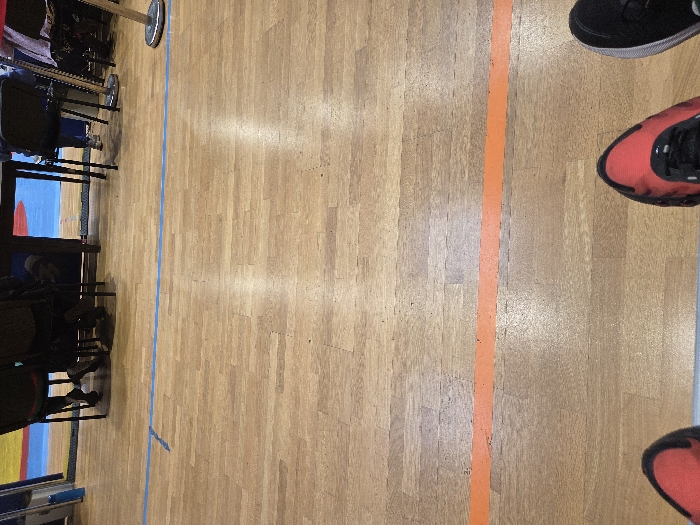 This image depicts an indoor sports facility in Panagyurishte, Bulgaria, from a low-angle perspective. The foreground consists of a light-brown wooden floor with visible reflections from overhead lighting. An orange demarcation line is taped horizontally across the lower portion of the floor. Just in front of this line, the feet of the individual capturing the image are visible: a black shoe with a white sole on the left, and a red and black athletic shoe on the right. Further into the scene, a blue demarcation line is taped horizontally across the floor, featuring a small perpendicular blue mark near its left end. Beyond this blue line, a dark-colored table is positioned, behind which at least three individuals are seated, with only their lower bodies, dark trousers, and shoes visible. Several dark chairs are situated around this table. A tall, cylindrical blue object is visible on the floor to the left of the table. A silver stanchion with a round base stands on the far right of the frame. The background reveals a section of a sports mat, displaying blue and red colored zones, consistent with a wrestling or martial arts area.