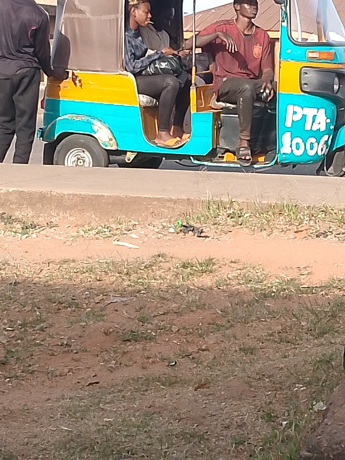 In Jos, Nigeria, a motorized trishaw, commonly known as a Keke NAPEP, is positioned on a paved road. The vehicle displays a two-tone design, with yellow paint on its upper panels and turquoise on the lower, showing visible wear and chipping. White lettering, "PTA-1006," is visible on the right side of the turquoise panel. Three individuals are present. On the far left, a person in dark attire is partially visible, standing beside the vehicle. Inside the trishaw, a female passenger sits on the left, wearing a plaid shirt, black leggings, and yellow sandals. She has a black bag on her lap and a cigarette held in her mouth. To her right, a male passenger is seated, wearing a maroon t-shirt with a white logo and dark pants, holding an unidentified small object in his right hand. The immediate foreground features a reddish-brown dirt patch with sparse green grass and scattered debris. This area is separated from the road by a concrete curb. Blurred structures with reddish-brown roofs are visible in the background under daylight conditions.