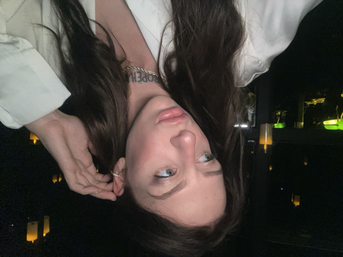 A woman with long brown hair, light skin, and green eyes gazes upward, her head tilted to the side. She wears a white shirt and a silver chain necklace. A tattoo is visible on her neck. She has a silver earring. The background is dark, with dimly lit lanterns and plants in jars.