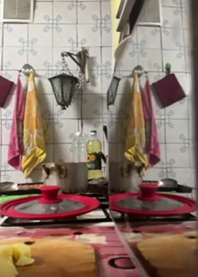 A woman stands in front of a stove, preparing food. Reflected in the glass oven door, she is seen on both sides of the frame. She wears a light-colored shirt and purple pants. Her hair is pulled back. On the stovetop, two pots with red-rimmed lids sit on burners. She carefully places chopped potatoes from a wooden cutting board into one of the pots. Behind her, the kitchen wall is covered in light blue and white patterned tiles. A vintage-style lantern hangs on the wall. Various kitchen towels and utensils adorn the space. Above, a ventilation grill is visible. The countertop is covered with a pink patterned surface.
