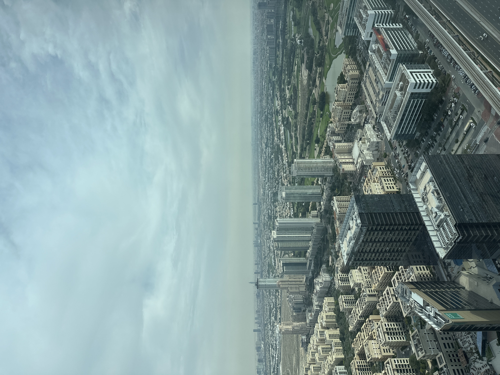 n aerial view of Dubai, United Arab Emirates. The scene includes a cityscape with a variety of buildings ranging from low-rise residential structures to tall skyscrapers. A golf course with water features and green fairways is visible. A highway with moving vehicles and elevated train tracks runs parallel to the cityscape. The sky is overcast with a layer of clouds.