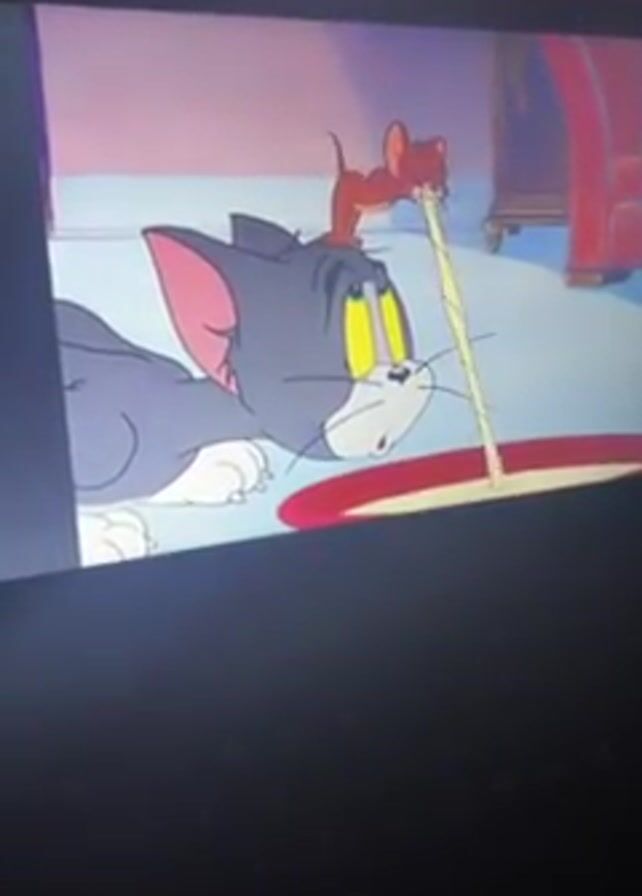 A video shows a screen displaying an animated scene from a "Tom and Jerry" cartoon