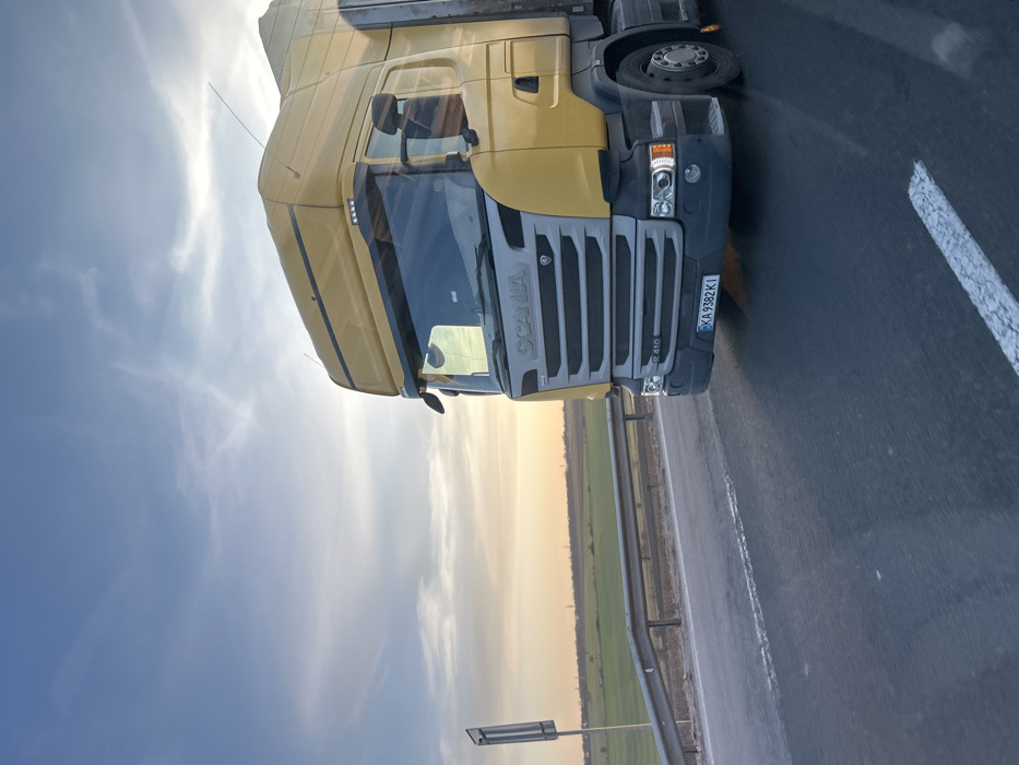 - "An exterior, eye-level, slightly front-quarter view depicts a yellow and grey Scania R 410 semi-trailer truck in motion on a highway near Shumen, Bulgaria, during either sunset or sunrise" by FM-dNBlh2, licensed under CC BY 4.0