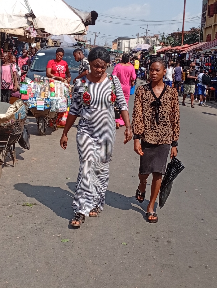 Two women walk down a busy street in what appears to be a market. The woman on the left wears a striped dress with floral embellishments and sandals. The woman on the right has on a leopard print top, dark skirt, and sandals, carrying a black bag. Vendors line both sides of the street, with goods displayed on carts and stalls. People mill about, creating a bustling atmosphere under the bright daylight.