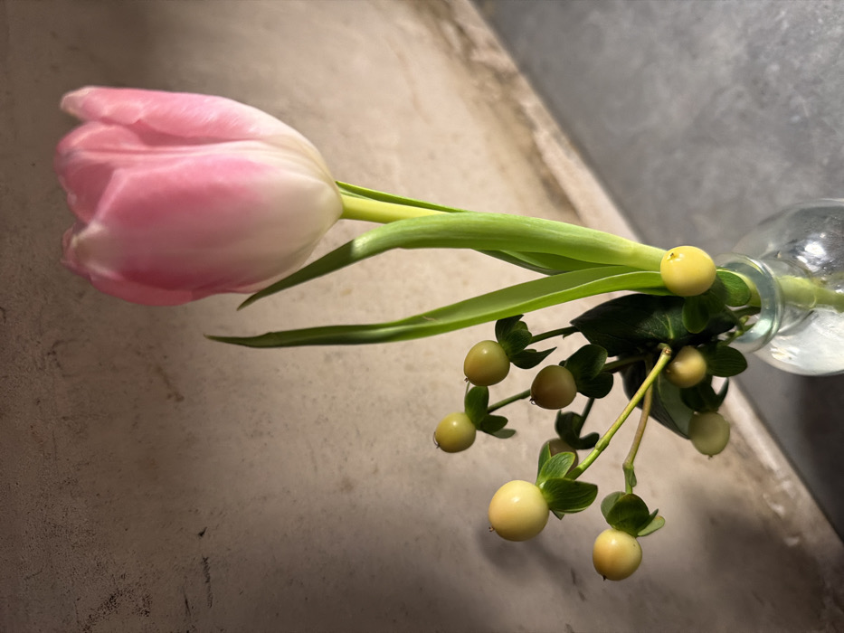 - "A single pink and white tulip lies horizontally across a neutral surface, its green stem accompanied by green leaves and a cluster of round, light yellow berries with small, dark green leaves attached to their stems" by FM-oB3Mx2, licensed under CC BY 4.0
