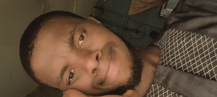 A dark-complexioned male subject, with short dark hair, a short beard, and a mustache, is depicted in a chest-up portrait. The scene is an indoor setting in Toto, Nigeria. The subject looks directly at the camera with a subtle smirk, his lips slightly pursed, and the left corner of his mouth slightly elevated. Fingers from the subject's left hand are visible adjacent to his left temple and cheek. He is dressed in a dark-colored garment, possibly a traditional Nigerian top, featuring a white diamond grid pattern embroidered on the chest and a band collar. The background is dim and indistinct, showing a dark wall or surface on the right, with dark, thin objects, resembling wires or draped fabric, and a lighter brown object visible further to the right.