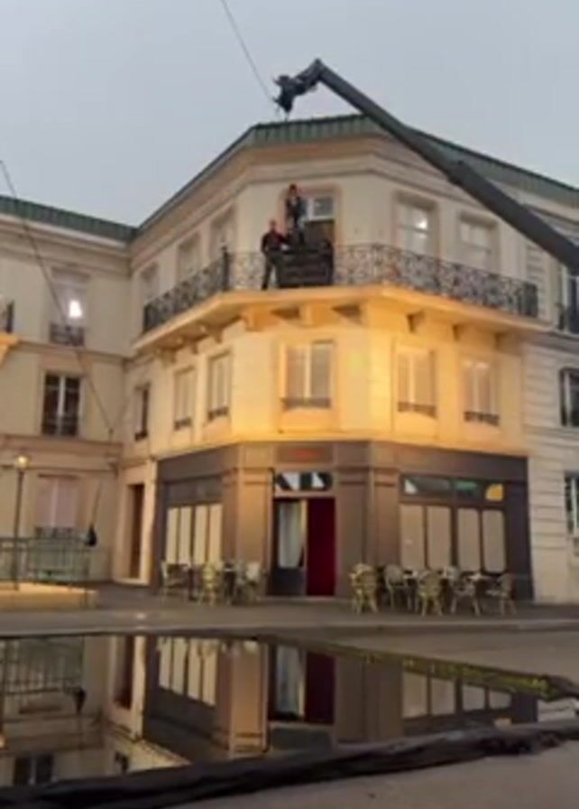 film shoot in progress. A European-style building with a restaurant at street level is the setting. On a balcony, a man in a suit is holding a rope while an actress in a black bodysuit falls from the balcony, suspended by wires. A crane is positioned nearby to assist in the stunt. Water has been placed on the street to create reflections. Someone yells "Top!" to begin the action.