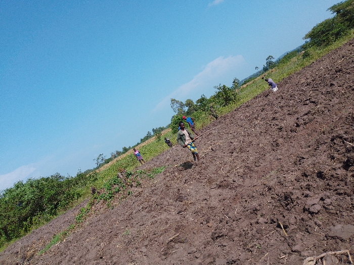 A vibrant scene unfolds on a steep, brown hillside beneath a clear blue sky. Several people are actively farming the land. A prominent figure in the foreground holds a tool, perhaps for tilling the soil. Other individuals are visible further up the slope, engaged in similar activities. Lush green vegetation borders the field, adding a touch of nature's contrast to the cultivated earth.